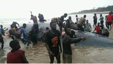 These are images of a grounded whale which was killed in the Niger Delta part of Nigeria